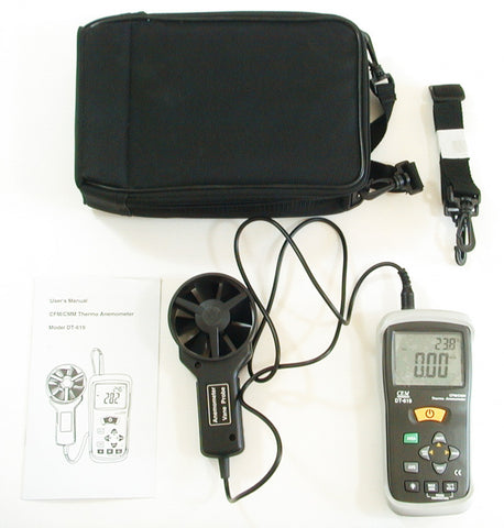 This is a brand new CEM DT-619 CE certified digital Thermo- Anemometer. This 2-in-1 meter measures the air flow / air velocity and the air temperature simultaneously. DT-619 has fast response, high accuracy design for the most demaning jobs. This device is a must have for measuring the wind speed (up to 108 Kmeters per hour) and air flow (up to 999.9 cubic meters per minute). The built-in thermometer measures the air temperature (up to 60 deg C) as the air speed is measured. DT-619 was designed to be used at home, office, factory or industrial building. This device operates on a 9V battery and is very portable due to its light weight.
