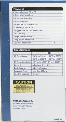 This is a brand new CEM DT-8862 IR temperature meter with CE certification. This infrared thermometer has built-in DUAL laser pointers and back-light LCD display. This top-of-the-line device has a narrow 12:1 distance to spot ratio and a wide range of -58 oF to 1202 oF (-50 oC to 650 oC). Forget the old analog devices, this newly designed digital light weight device gives you long lasting power with accurate measurement from safe distance. The build-in dual laser pointers help you aim better at the object for an accurate result. The back light LCD screen allows you to read easily in the dark.