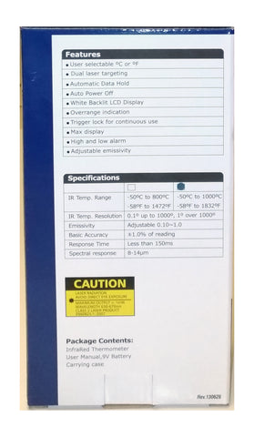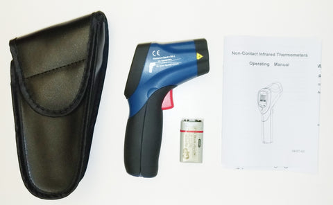 This is a brand new CEM DT-8865 CE certified digital non-contact infrared thermometer with built-in dual laser pointers and back-light LCD display. This compact device has a narrow 30:1 distance to spot ratio and a wide range of -58 oF to 1832 oF (-50 oC to 1000 oC). Forget the old analog devices, this newly designed digital light-weight device gives you long lasting power with accurate measurement from safe distance. The build-in dual laser pointers help you aim better at the object for an accurate result. The back light LCD screen allows you to read easily in the dark. It also comes with a heavy duty carrying pouch to protect your device when working in the field.