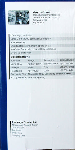 This is a brand new CEM DT-9809 CE certified digital LCD AC leakage current tester and voltage meter. This meter measures AC leakage current with resolution from 10uA to 100mA. The maximum resolution on voltage measurement is 0.1V. This AC leakage current tester, DT-9809, is very useful for power system check and installation. With the measuring range up to 100A, this tester is also great for appliance installation and for car applications.